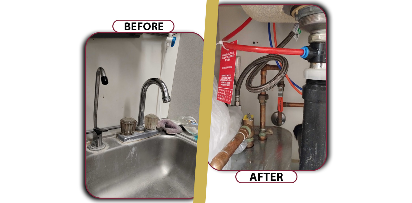 The calcification had caused internal damage to the supply lines, making removal difficult and increasing the risk of additional component failure during disassembly. Care was required to avoid damaging surrounding plumbing and to minimize downtime for pharmacy operations.